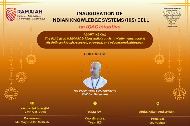 Dr. M.S. Ramaiah, a visionary and philanthropist, established Gokula Education Foundation (GEF) in the year 1962, to deliver education and healthcare for the betterment of mankind. The Gokula Education Foundation as a registered Trust runs several educational institutions under the flagship of GEF, M.S. Ramaiah College of Arts, Science and Commerce (MSRCASC) was established in 1994. The college is permanently affiliated to Bengaluru City University (BCU). The institution has received the autonomous status from UGC, Government of Karnataka and Bengaluru City University from the academic year 2023-24. The Institution is recognized by the UGC under Sections 2(f) and 12(B) of the UGC Act of 1956. The Institution is reaccredited with an "A" grade by NAAC in its 4th cycle in the year November 2021.