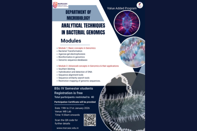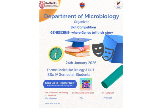 M S Ramaiah College of Arts, Science and Commerce (MSRCASC), Bengaluru, was established in 1994 under the aegis of the Gokula Education Foundation (GEF), founded in 1962 by the visionary philanthropist Dr. M.S. Ramaiah with the mission of advancing education and healthcare for the betterment of society. The college is permanently affiliated with Bengaluru City University and is recognized by the University Grants Commission (UGC) under Sections 2(f) and 12(B) of the UGC Act, 1956, with approval from AICTE. In recognition of its academic governance and quality standards, MSRCASC was conferred autonomous status by the UGC, the Government of Karnataka, and Bengaluru City University with effect from the academic year 2024–25. The institution offers a diverse range of undergraduate, postgraduate and PhD programmes across Arts, Science, Commerce, and Management, supported by industry-relevant curricula that are periodically updated to align with emerging trends, technological advancements, and societal needs