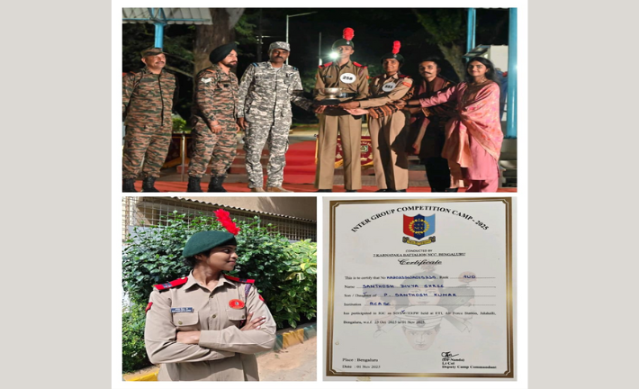 Senior Under Officer Santhosh Divya Shree, NCC Regimental No. KA2023SWA015335, proudly represents 8 KAR BN, Bangalore-B Group, Karnataka & Goa Directorate, NCC Army Wing. She is a final-year BA Humanities student specializing in Political Science and Journalism at MSRCASC. Her NCC journey has been a remarkable path of growth and leadership. She began her journey in NCC as a Cadet, rose to Corporal, progressed to Sergeant, earned the role of Junior Under Officer, and today serves as a Senior Under Officer. Each rank has strengthened her discipline, confidence, and commitment to service. One of her recent and significant achievements is her participation in the RDC Cultural Selections, where she successfully cleared the Inter-Group Competition. Bangalore-B Group secured First Place in Group Dance and excelled in five additional events, ultimately winning the Overall Championship at the Inter-Group Competition held at ETI Jalahalli. Being part of this victorious team has been an inspiring experience that further enhanced her discipline, teamwork, and leadership skills. She is honoured to have been selected for PRE-RDC 2 and looks forward to representing her battalion and directorate with continued dedication, confidence, and commitment to excellence.