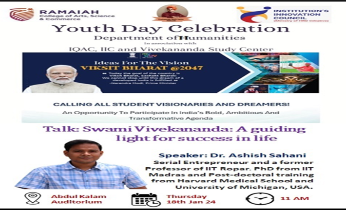 The Department of Humanities, in association with IQAC, IIC, and the Vivekananda Study Centre, organized a Guest Lecture on 18th January 2024 as part of Youth Day celebrations. The session was conducted at Abdul Kalam Auditorium from 11:30 AM to 1:00 PM. Dr. Ashish Sahani served as the resource person for the lecture titled 'Swami Vivekananda – A Guiding Light for Success in Life,' held under the initiative 'Viksit Bharat 2047 – Voice of Youth.' The program began with inaugural remarks by Ms. Namisha Kadam, IIC Student Member, who highlighted the purpose of Youth Day and the vision of IIC. Dr. Sahani spoke on key themes such as education, dignity, self-respect, self-help, and the power of concentration. He emphasized the concept of 'Shraddha'—focusing deeply on everything we do. He narrated inspiring life examples of Swami Vivekananda and discussed how modern technology often limits human potential. The lecture was insightful not only for students but also for faculty members. Dr. Sahani explained the three types of teachers — Shikshak (teaches and practices physically), Acharya (teaches and practices intellectually), and Guru (teaches and practices spiritually). His words served as an eye-opener for the audience. Overall, the event was impactful and enriching, reinforcing values of mindfulness, focus, and meaningful education for both students and faculty.