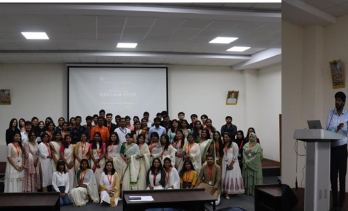 The Department of Humanities organized a Guest Lecture on 29th August 2023 in observance of the International Day Against Nuclear Tests. The session featured Dr. Karamala Areesh Kumar, Assistant Professor and Head of the Department of International Relations, Peace and Public Policy at St. Joseph’s University, Bengaluru, as the resource person. The event was held at 11:00 AM in Vishweshwaraiah Auditorium and was open to all UG and PG students. The lecture provided valuable insights into nuclear tests, international organizations, and geopolitics. Students actively participated and benefitted from the enriching discussion.