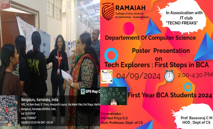 The Computer Science Department, coordinated by Mrs. Haripriya GS, organized a poster presentation event for the BCA first-year students of 2024 as part of the IT Club – "Techno Freaks," with the theme "Tech Explores: First Steps into BCA." Held on 4th September 2024, from 2:00 PM to 4:30 PM, the event took place in front of the Computer Science Department on the 5th level.