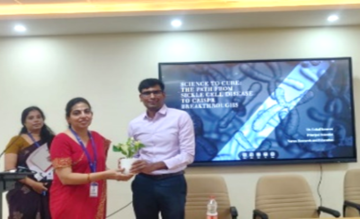 The Guest lecture, ‘Science to Cure: The path from Sickle Cell Disease to CRISPR breakthroughs’ on July 18, 2024, ignited the curiosity of BSc I Semester students- autonomous batch, by Dr. Gokul Kesavan, Founder and Scientist, Vertex Research and Education. The guest lecture engaged and exposed the students with transformative power of research.
