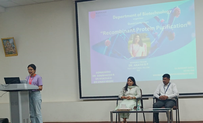 On August 14, 2024, the Department of Biotechnology organized a guest lecture titled "Recombinant Protein Purification" at Visveswaraiah Seminar Hall, attended by 88 MSc Biotechnology students from the II and IV semesters. Dr. Arathi B P, a Postdoctoral Fellow at the Indian Institute of Science (IISc), Bengaluru, delivered the lecture, providing valuable insights into the purification processes essential for biotechnological applications such as drug development and enzyme production. Dr. Arathi’s engaging lecture covered critical topics, including various expression systems, challenges in purification, and the applications of recombinant proteins in pharmaceuticals and diagnostics. She also presented case studies that facilitated interactive discussions among students, allowing them to clarify their doubts.