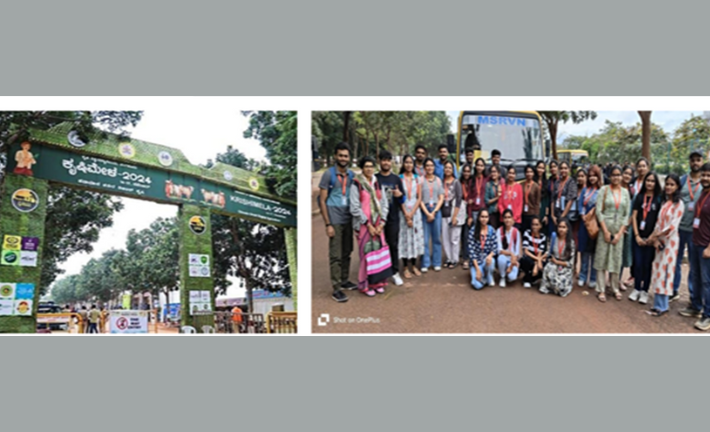 M.Sc. Biotechnology students visited Krishimela 2024 at GKVK, Bengaluru, on 15 November 2024, accompanied by faculty members. The visit was organized to provide students with practical exposure to recent advancements in agriculture, including innovative crop varieties, modern farm implements, organic inputs, precision farming tools, and sustainable farming technologies.