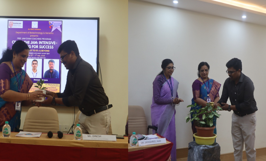 The Department of Biotechnology and Genetics organized IIT JAM Coaching classes for Life Science students from 10 January 2026 to 7 February 2026 at M.S. Ramaiah College of Arts, Science and Commerce (Autonomous). The program was inaugurated by the Chief Guest Mr. Dinesh S., Mentor and UPSC Specialist, in the presence of Dr. Pushpa H., Principal, and Prof. Jayashree D.R., Head, Department of Biotechnology and Genetics. The resource persons for the program were Dr. Pratheek B.M. and Dr. Dileep Kumar M.G., Assistant Professors, Department of Biotechnology and Genetics, MSRCASC. The coaching sessions were structured to provide systematic and comprehensive coverage of key topics aligned with the IIT JAM Life Science syllabus. The primary objective of the program was to strengthen students’ conceptual clarity, enhance analytical thinking, and improve numerical problem-solving skills. Students were also familiarized with the examination pattern, question trends, and difficulty level to help them approach the IIT JAM examination with greater confidence and preparedness.