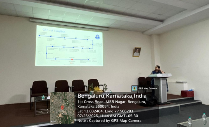 The main session was conducted by the Resource Person, Ms. Rachna, IRS. Her lecture, titled "Goods and Services Tax: A Story of Extraordinary National Ambition," traced the evolution of GST from its conception to implementation. She elaborated on the concept of GST as a consumption tax, explained the dual GST model unique to India, and outlined the significant milestones leading up to the launch of GST. Her session highlighted statistical achievements, the IT architecture supporting the system, and how GST has enhanced transparency in trade and tax compliance, especially in international trade scenarios.