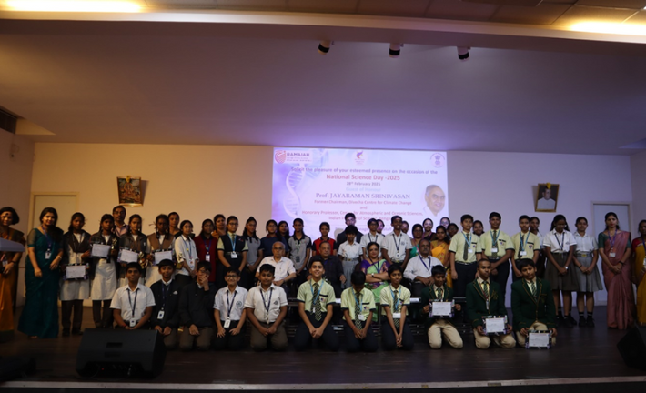 National Science day was celebrated on 28th feb 2025. The guest of honour was Prof. Jayaraman Srinivasan, Former Chairman Divecha Center for Climate Change. He gave a talk on climate change its importance and consequences. As a part of National Science day celebration, on 11th of feb and 27th feb 2025 various activities were conducted for school kids and students of Ramaiah college for which prize distribution was done on 28th feb.