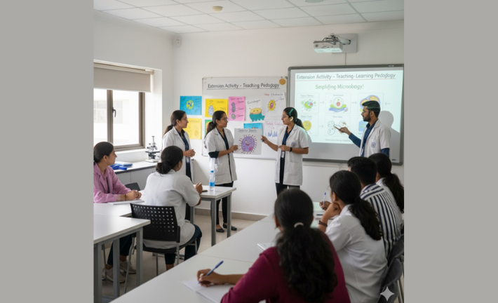 The extension activity is an innovative teaching–learning approach where postgraduate students take part in teaching school children as part of their curriculum. This activity enhances their communication and presentation skills while enabling them to design creative and student-friendly teaching methods. By simplifying complex microbiology concepts, PG students gain confidence and teaching experience, making the activity mutually enriching for both groups.