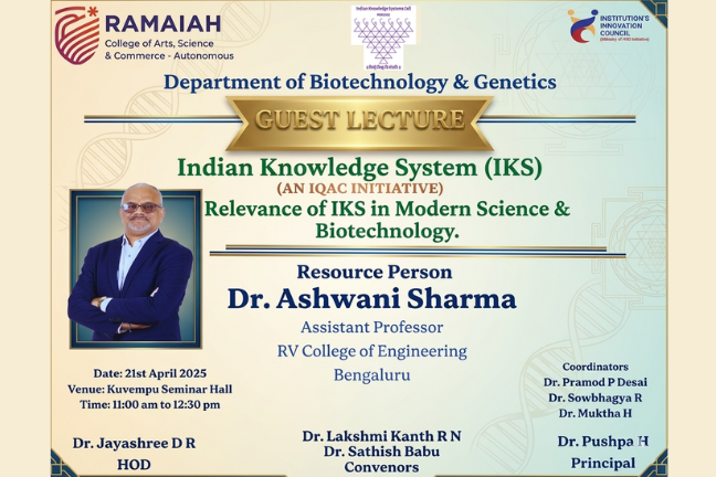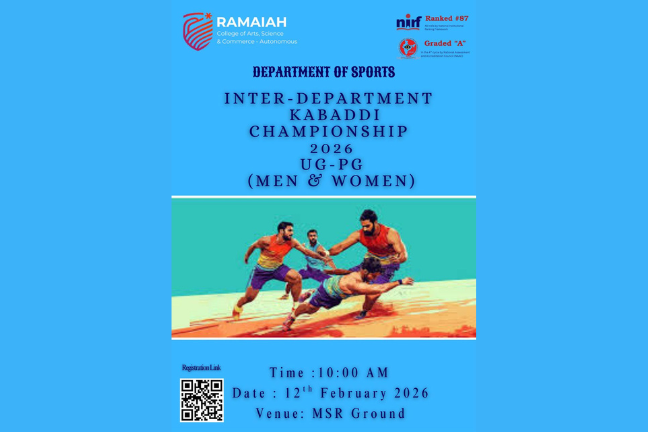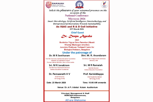 M S Ramaiah College of Arts, Science and Commerce (MSRCASC), Bengaluru, was established in 1994 under the aegis of the Gokula Education Foundation (GEF), founded in 1962 by the visionary philanthropist Dr. M.S. Ramaiah with the mission of advancing education and healthcare for the betterment of society. The college is permanently affiliated with Bengaluru City University and is recognized by the University Grants Commission (UGC) under Sections 2(f) and 12(B) of the UGC Act, 1956, with approval from AICTE. In recognition of its academic governance and quality standards, MSRCASC was conferred autonomous status by the UGC, the Government of Karnataka, and Bengaluru City University with effect from the academic year 2024–25. The institution offers a diverse range of undergraduate, postgraduate and PhD programmes across Arts, Science, Commerce, and Management, supported by industry-relevant curricula that are periodically updated to align with emerging trends, technological advancements, and societal needs