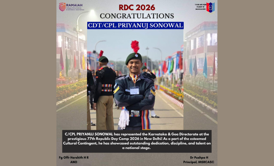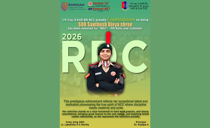 Senior Under Officer Santhosh Divya Shree, NCC Regimental No. KA2023SWA015335, proudly represents 8 KAR BN, Bangalore-B Group, Karnataka & Goa Directorate, NCC Army Wing. She is a final-year BA Humanities student specializing in Political Science and Journalism at MSRCASC. Her NCC journey has been a remarkable path of growth and leadership. She began her journey in NCC as a Cadet, rose to Corporal, progressed to Sergeant, earned the role of Junior Under Officer, and today serves as a Senior Under Officer. Each rank has strengthened her discipline, confidence, and commitment to service. One of her recent and significant achievements is her participation in the RDC Cultural Selections, where she successfully cleared the Inter-Group Competition. Bangalore-B Group secured First Place in Group Dance and excelled in five additional events, ultimately winning the Overall Championship at the Inter-Group Competition held at ETI Jalahalli. Being part of this victorious team has been an inspiring experience that further enhanced her discipline, teamwork, and leadership skills. She is honoured to have been selected for PRE-RDC 2 and looks forward to representing her battalion and directorate with continued dedication, confidence, and commitment to excellence.