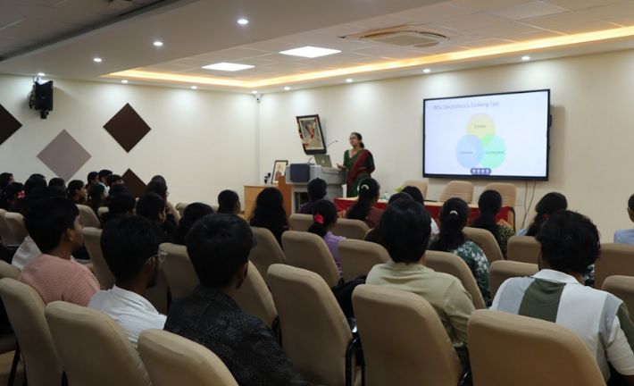 The Department of Electronics conducted on "Emerging Technologies in Electronics" for I, III and V semester EMCs students. on 04-08-2025 with the objective of enhancing students’ knowledge about the latest developments and future trends in the field of electronics. The session was graced by Dr. Sara Mohan George, an eminent academician and researcher with deep expertise in embedded systems, wearable devices, and signal processing, who served as the resource person. The program was held under the guidance of Mrs. Haritha A, Head of the Department. The expert talk proved to be highly informative and motivating, equipping the students with broader perspectives on the future scope of electronics.