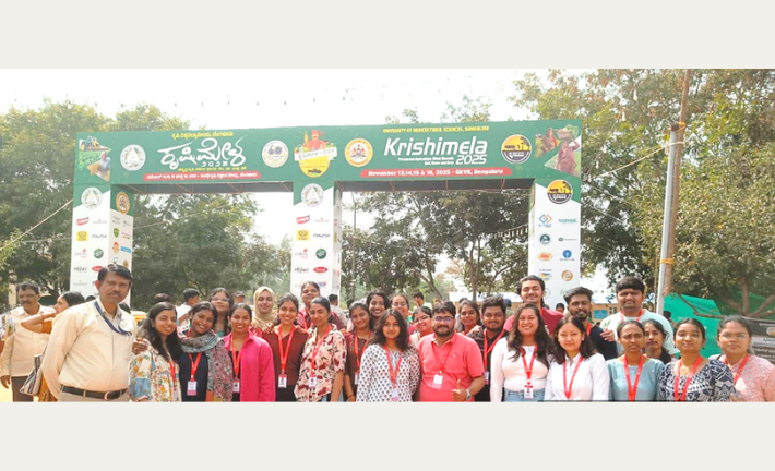 M.Sc. Biotechnology students visited Krishimela 2024 at GKVK, Bengaluru, on 15 November 2024, accompanied by faculty members. The visit was organized to provide students with practical exposure to recent advancements in agriculture, including innovative crop varieties, modern farm implements, organic inputs, precision farming tools, and sustainable farming technologies.