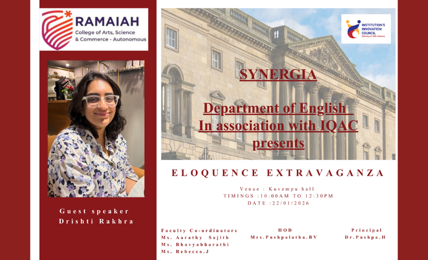 The Synergia Club, Department of English, in association with the Internal Quality Assurance Cell (IQAC), organised Eloquence Extravaganza, a language-focused three-part workshop on 22nd January 2026 at the MCA Gallery Lab, 6th Floor, M.S. Ramaiah College of Arts, Science and Commerce (Autonomous), Bengaluru. The session was attended by BA Ist and IInd year students, fostering an interactive and reflective academic environment.