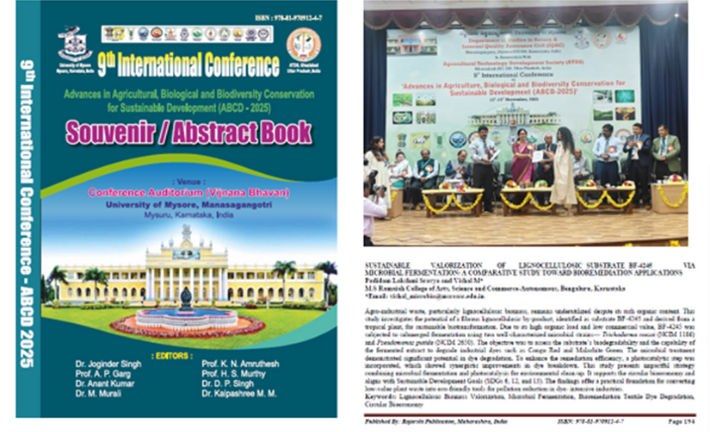 We proudly congratulate Dr. Vishal M. and his student, Ms. Lakshmi Sravya (B.Sc.Biotechnology & Microbiology, 2022–2025), for their notable success at the 9thInternational Conference on “Advances in Agricultural, Biological and BiodiversityConservation for Sustainable Development (ABCD–2025).” Ms. Sravya’s project,"SUSTAINABLE VALORIZATION OF LIGNOCELLULOSIC SUBSTRATEBF-4245 VIA MICROBIAL FERMENTATION: A COMPARATIVE STUDYTOWARD BIOREMEDIATION APPLICATIONS," conducted under Dr. VishalM.'s guidance, secured the prestigious 3rd Prize, showcasing the high quality of theircollaborative research and its significant potential for sustainable bioremediationapplications.