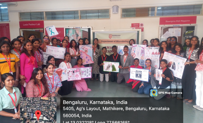 The Department of Microbiology, in association with NSS and IIC, conducted an extension activity on World Tuberculosis Day to create public awareness regarding TB infection, its symptoms, prevention, and control. A total of 31 M.Sc. Microbiology students participated by preparing and displaying informative posters at Mathikere residential area and BEL Road signal junction. The awareness was delivered in multiple languages including Kannada, Telugu, Tamil, Malayalam, and Hindi, reaching nearly 200 people. The activity emphasized health, hygiene, early diagnosis, and prevention, with active participation from BBMP workers who interacted with the students to understand the importance of maintaining cleanliness and controlling the spread of TB.
