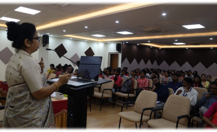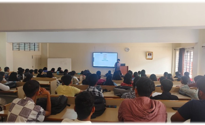 The Department of Microbiology organized a guest lecture on “Avenues in Biology” as part of the induction program for first-year students. Dr. Sushama Yermal delivered an engaging and insightful session, introducing students to the evolution of biology from classical disciplines to advanced domains like synthetic biology, systems biology, and computational biology.